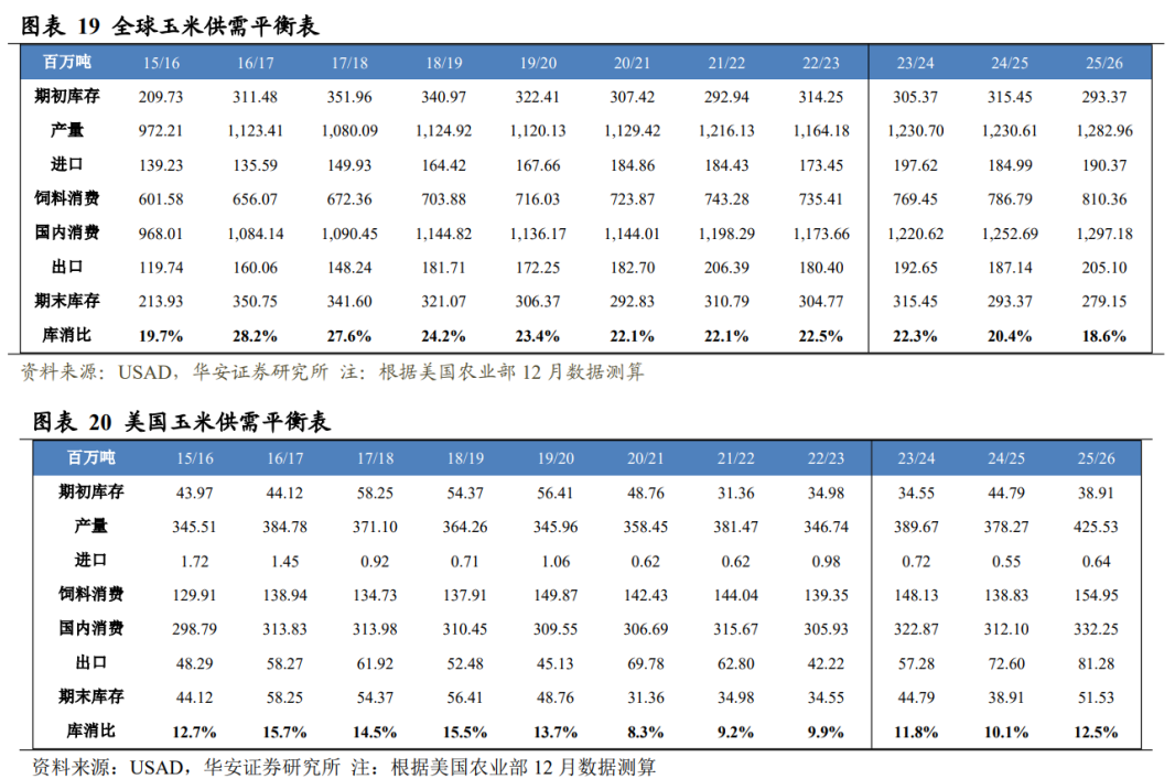 分国别看,2025/26 年度美国玉米产量 4.26 亿吨,国内消费量 3.32 亿吨,期末库存 5,153 万吨,库消比 12.5%,较 24/25 年度上升 2.35 个百分点;2025/26 年度中国玉米产量 2.95 亿吨,国内消费量 3.21 亿吨,期末库存 1.74 亿吨,库消比 54.2%,较 24/25 年度下降 6.56 个百分点。