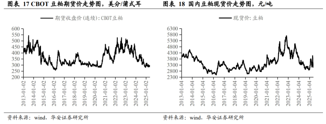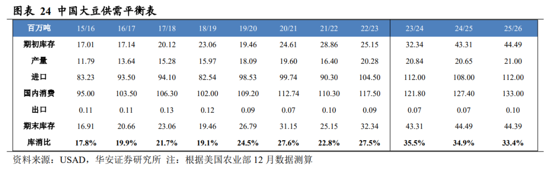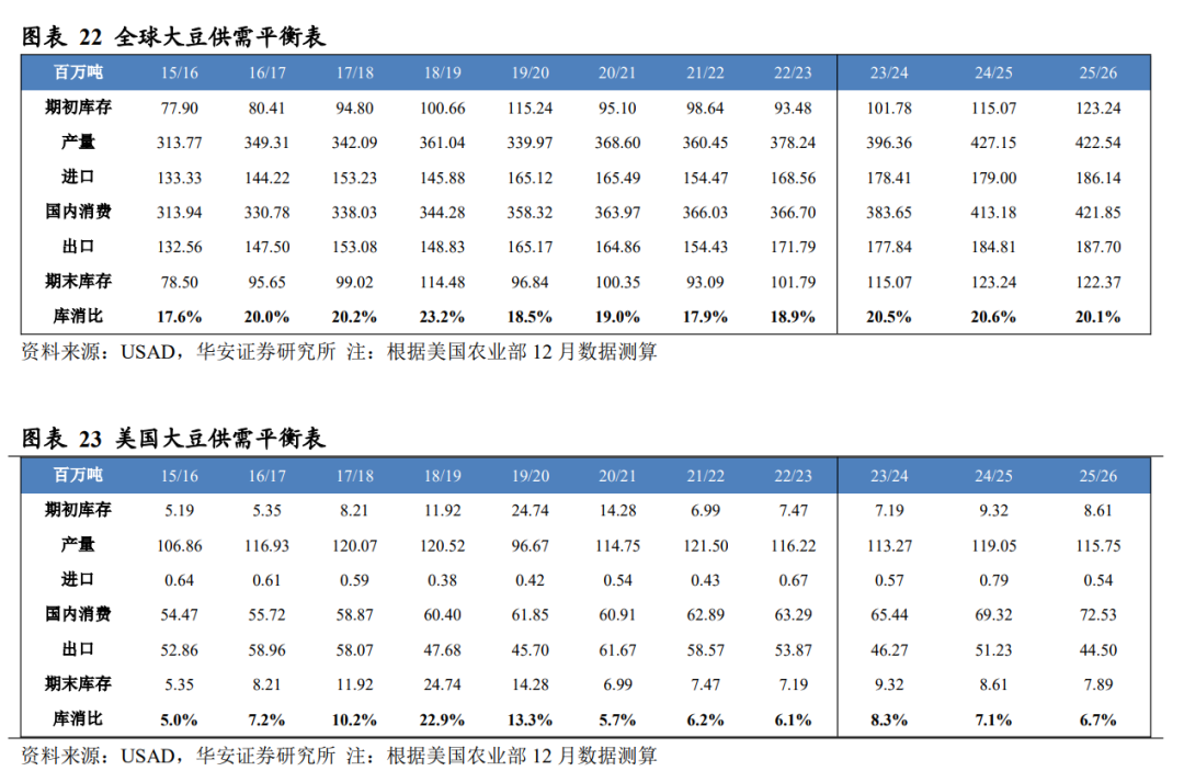 分国别看,2025/26 年度美国大豆产量 1.16 亿吨,国内消费量 7,253 万吨,期末库存 789 万吨,库消比 6.7%,较 24/25 年度下降 0.40 个百分点;2025/26 年度中国大豆产量 2,100 万吨,国内消费量 1.33 亿吨,期末库存 4,439 万吨,库消比 33.4%,较 24/25 年度下降 1.55 个百分点。