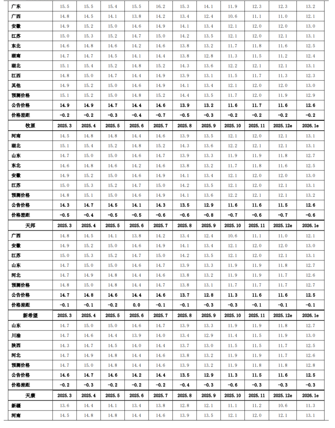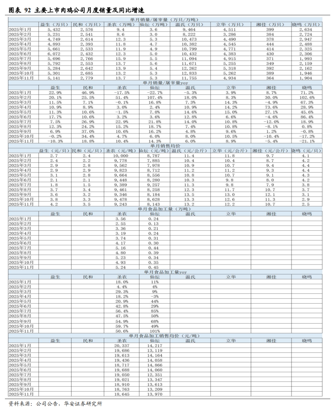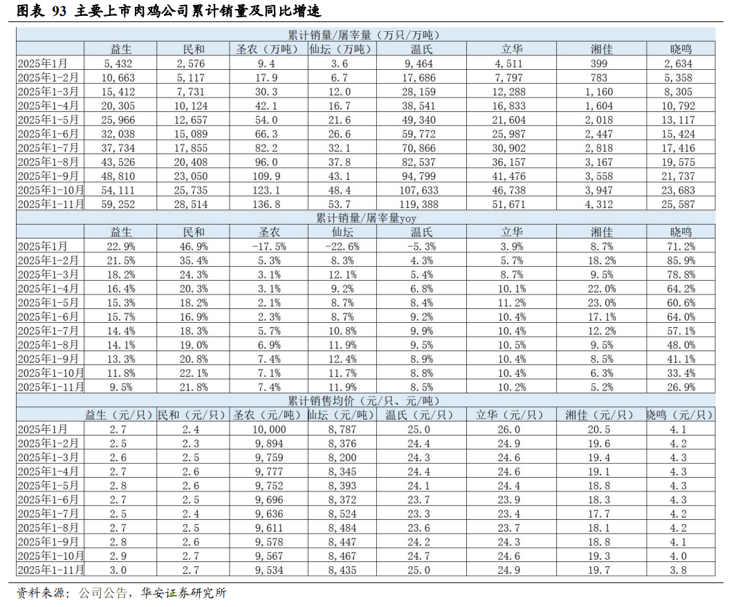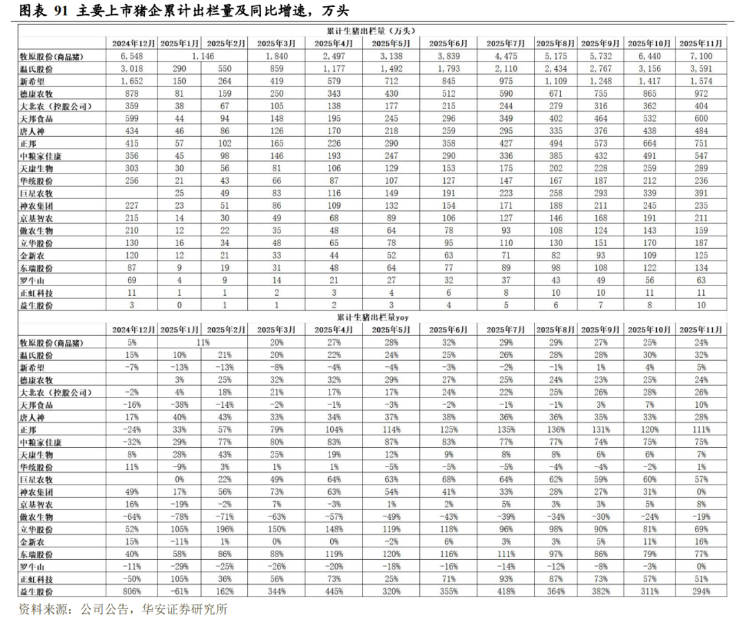 2025 年 1-11 月,20 家上市猪企出栏量 18,065 万头,同比+28.1%,出栏量(万头)从高到低依次为,牧原 7100(仅商品猪出栏量)、温氏 3591、新希望1574、德康农牧 972、正邦 751、天邦食品 600、中粮家佳康 547、唐人神 484、大北农(控股公司)404、巨星农牧 391、天康生物 289、华统股份 236、神农集团 235、京基智农 211、立华股份 187、傲农生物(维权) 159、东瑞 134、金新农 125、罗牛山 63、正虹科技 11;出栏量同比增速从高到低依次为,正邦 111%、东瑞77%、中粮家佳康 75%、立华股份 69%、巨星农牧 57%、正虹科技 51%、温氏32%、唐人神 28%、大北农(控股公司)26%、德康农牧 24%、牧原 24%、金新农 16%、天邦食品 10%、京基智农 8%、天康生物 7%、新希望 5%、华统股份 1%、神农集团 0%、罗牛山 0%、傲农生物-19%。
