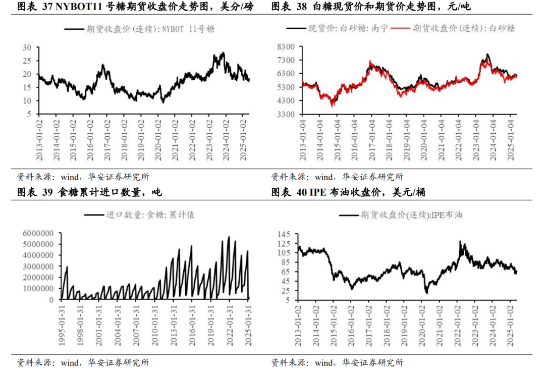 本周五,NYBOT 11 号糖期货收盘价 14.60 美分/磅,周环比跌 4.58%,同比跌25.55%;IPE 布油收盘价 60.80 美元/桶,周环比跌 2.38%,同比跌 19.95%。