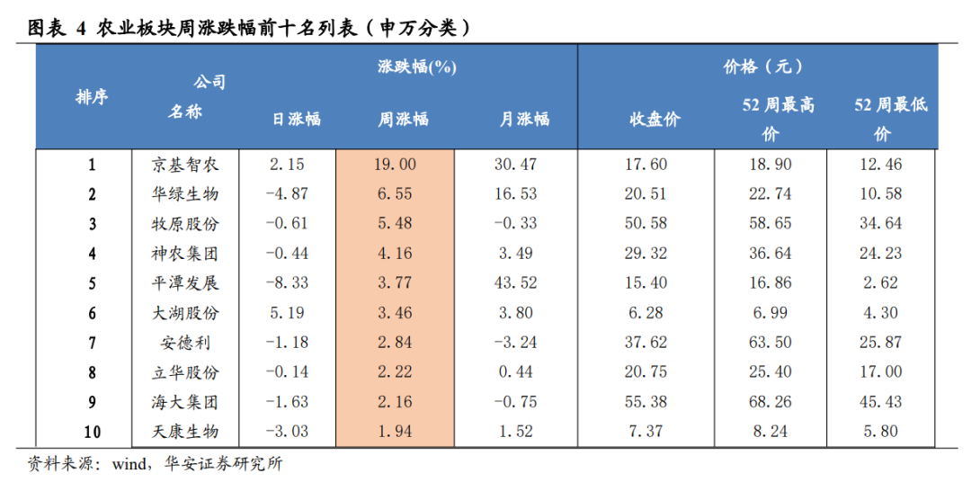 本周(2025 年 12 月 29 日-2026 年 1 月 2 日)农林牧渔(申万)指数上涨 0.13%,沪深 300 指数下跌 0.59%,中小板综指数下跌 0.19%,农业指数跑赢沪深 300 指数0.72 个百分点。