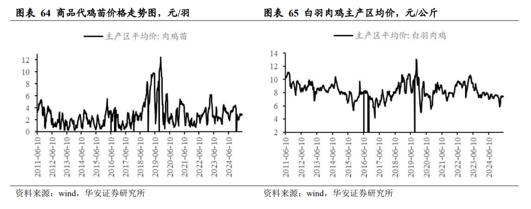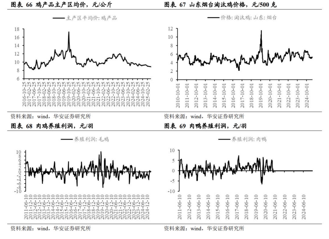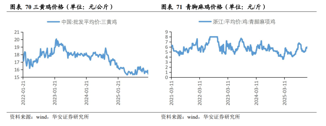 2026 年 1 月 2 日,三黄鸡均价 15.43 元/公斤,周环比跌 2.89%,同比跌 8.37%;2025 年 12 月 30 日,青脚麻鸡均价 6.00 元/斤,周环比涨 1.69%,同比涨 42.86%。