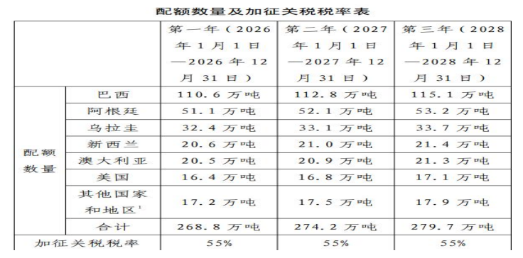 自 2026 年 1 月 1 日起,进口牛肉未超出规定数量的,进口经营者在进口牛肉时,按现行适用关税税率缴纳关税,上一年度内未使用完的配额数量不结转至下一年度。自进口牛肉达到规定数量的第 3 日起(含当日),进口经营者在进口牛肉时,应在现行适用关税税率的基础上加征 55%关税。