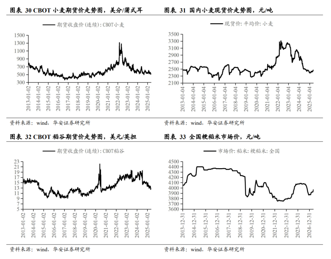 本周五,小麦现货 2515.56 元/吨,周环比涨 0.08%,同比涨 4.94%;粳稻米 12月 31 日现货 3951.00 元/吨,10 天环比涨 0.20%,同比涨 1.94%。