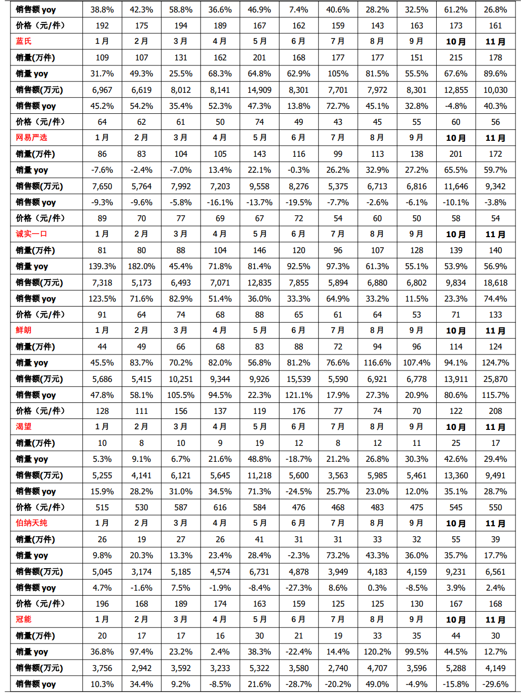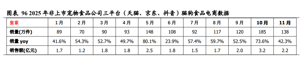 2025 年 11 月皇家、蓝氏、诚实一口、鲜朗、渴望销售额同比+26.8%、+40.3%、74.4%、+115.7%、+28.7%。2025 年 11 月,皇家三平台(天猫、京东、抖音)销售额同比+26.8%,蓝氏销售额同比+40.3%,网易严选销售额同比-3.8%,诚实一口销售额同比+74.4%,鲜朗销售额同比+115.7%,渴望销售额同比+28.7%,博纳天纯销售额同比+2.4%,冠能销售额同比-29.6%,凯锐思销售额同比-13.2%,疯狂小狗销售额同比-13.4%,阿飞和巴弟销售额同比+8.4%,比瑞吉销售额同比-39.9%。