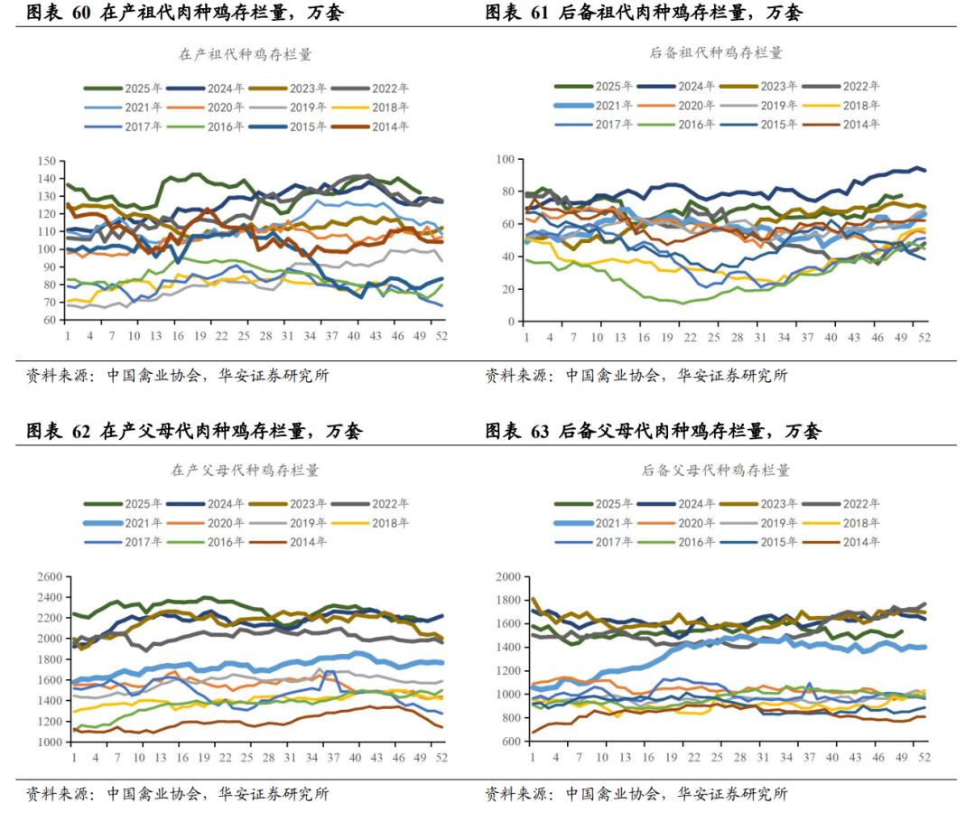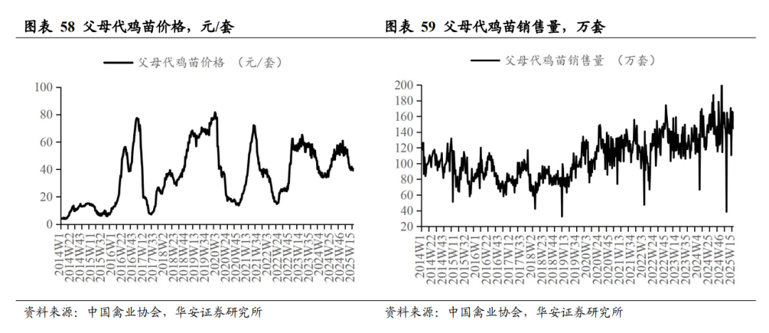 据中国禽业分会披露数据,2025 年第 49 周(2025 年 12 月 1 日- 2025 年 12 月 7日) 父母代鸡苗价格 42.13 元/套,周环比跌 2.17%,同比跌 22.82%;父母代鸡苗销量 187.24 万套,周环比跌 6.66%,同比涨 63.61%;在产祖代种鸡存栏 131.88 万套,周环比跌 1.71%,同比涨 2.50%;后备祖代种鸡存栏 77.33 万套,周环比涨 1.88%,同比跌 16.01%;在产父母代种鸡存栏 2168.89 万套,周环比跌 1.43%,同比跌 0.55%;后备父母代种鸡存栏 1532.30 万套,周环比涨 2.85%,同比跌 8.41%。