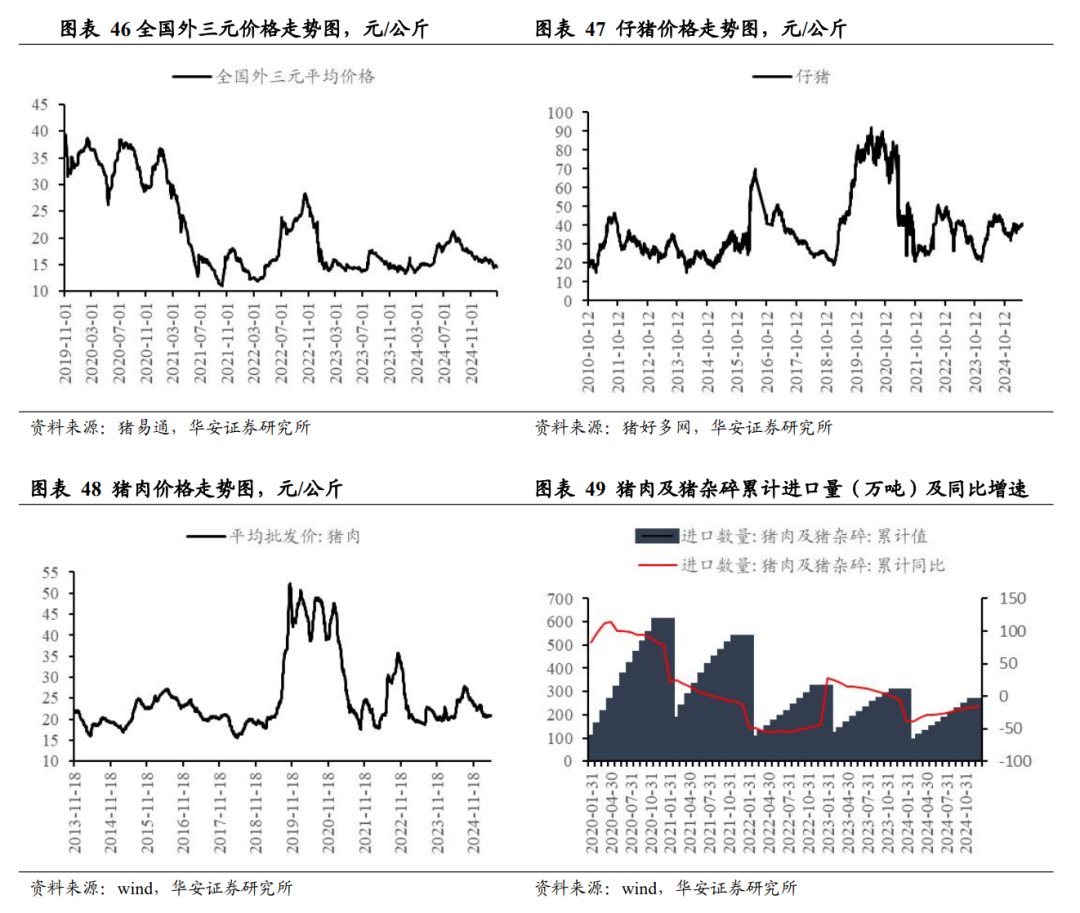 ①商务部对进口牛肉实施保障措施的裁定提前落地。商务部决定以“国别配额及配额外加征关税”的形式对进口牛肉采取保障措施,对规定数量之外的进口牛肉在现行适用关税税率的基础上加征关税,加征关税税率为 55%;保障措施实施期限 3 年,自 2026 年 1 月 1日至 2028 年 12 月 31 日,保障措施在实施期间内按固定时间间隔逐步放宽。2019 年-2024 年,我国牛肉进口量从 166 万吨持续攀升至287 万吨,2025 年 1-11 月,我国牛肉进口量 260 万吨,对照 2026-2028年牛肉进口配额总量 268.8 万吨、274.2 万吨和 279.7 万吨,本次牛肉进口政策的落地有助于抑制牛肉进口,保护国内肉牛产业;②今年上半年我国肉牛价格有望加速上行。2020-2023 年新冠疫情造成我国消费需求下降,供给过快增长导致 2020-2022 年肉牛价格出现滞涨,2023 年牛肉价格开启了二十年以来的第一轮大跌。2023-2025年,我国能繁母牛持续去化,2025 年 9 月末我国牛存栏已降至 9,932万头,较 2023 年末累计下降 5.5%,为牛价大涨奠定基础。牛属于单胎动物,且养殖周期漫长,从能繁母牛怀孕到育成牛出栏需要约28 个月,我们推算,今年上半年我国肉牛价格将开始加速上行,伴随着本次牛肉进口政策的落地,本轮牛价上涨有望持续至 2028 年,建议继续关注牛产业链。