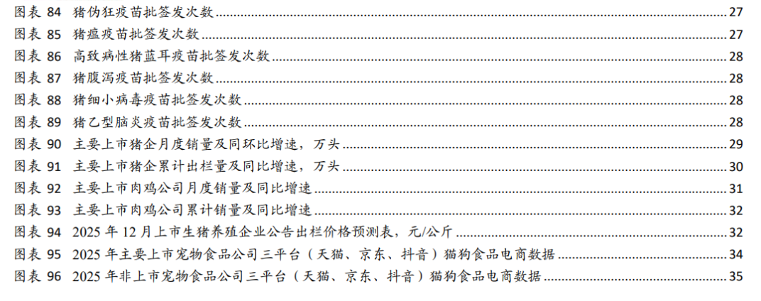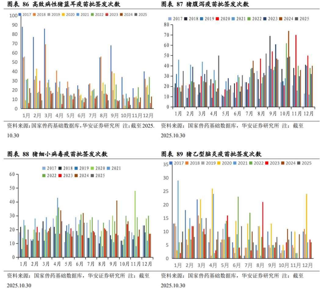 2025 年 1-10 月,猪用疫苗批签发数同比增速由高到低依次为,猪伪狂犬疫苗+24.8%、猪乙型脑炎疫苗+18.9%、猪圆环疫苗+17.7%、腹泻苗+15.9%、口蹄疫苗+6.0%、猪瘟疫苗-0.7%、猪细小病毒疫苗-12.3%、高致病性猪蓝耳疫苗-20.4%。