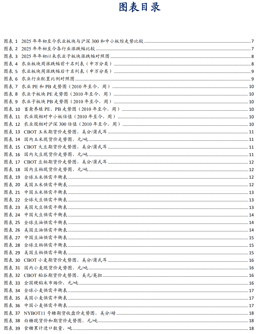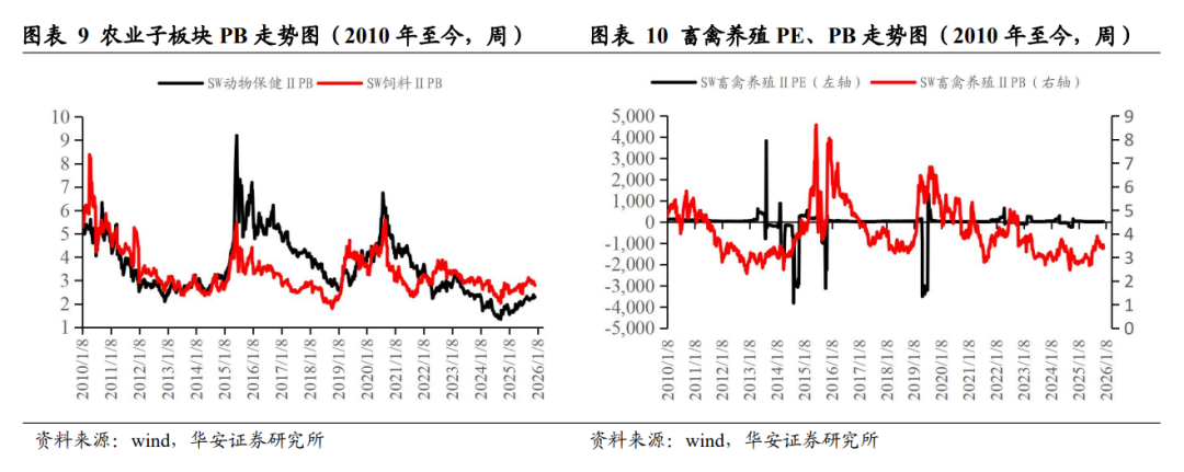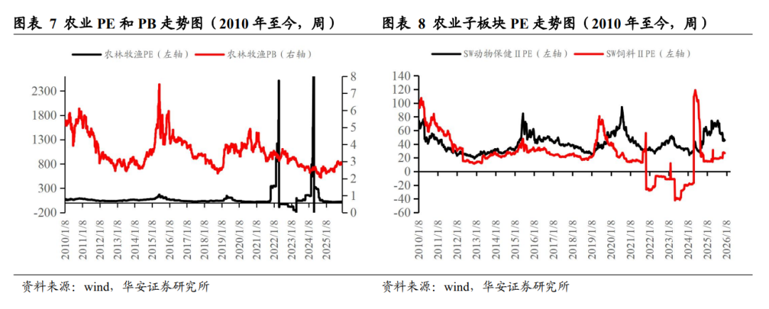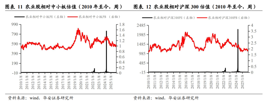 2025 年 12 月 31 日,农业板块绝对 PE 和绝对 PB 分别为 25.52 倍和 2.86 倍,2010 年至今农业板块绝对 PE 和绝对 PB 的历史均值分别为 109.51 倍和 3.56 倍;农业板块相对中小板 PE 和 PB 分别为 0.60 倍和 0.98 倍,历史均值分别为 3.09 倍和 1.09倍;农业板块相对沪深 300 PE 和 PB 分别为 1.80 和 1.84 倍,历史均值分别为 9.22倍和 2.34 倍。