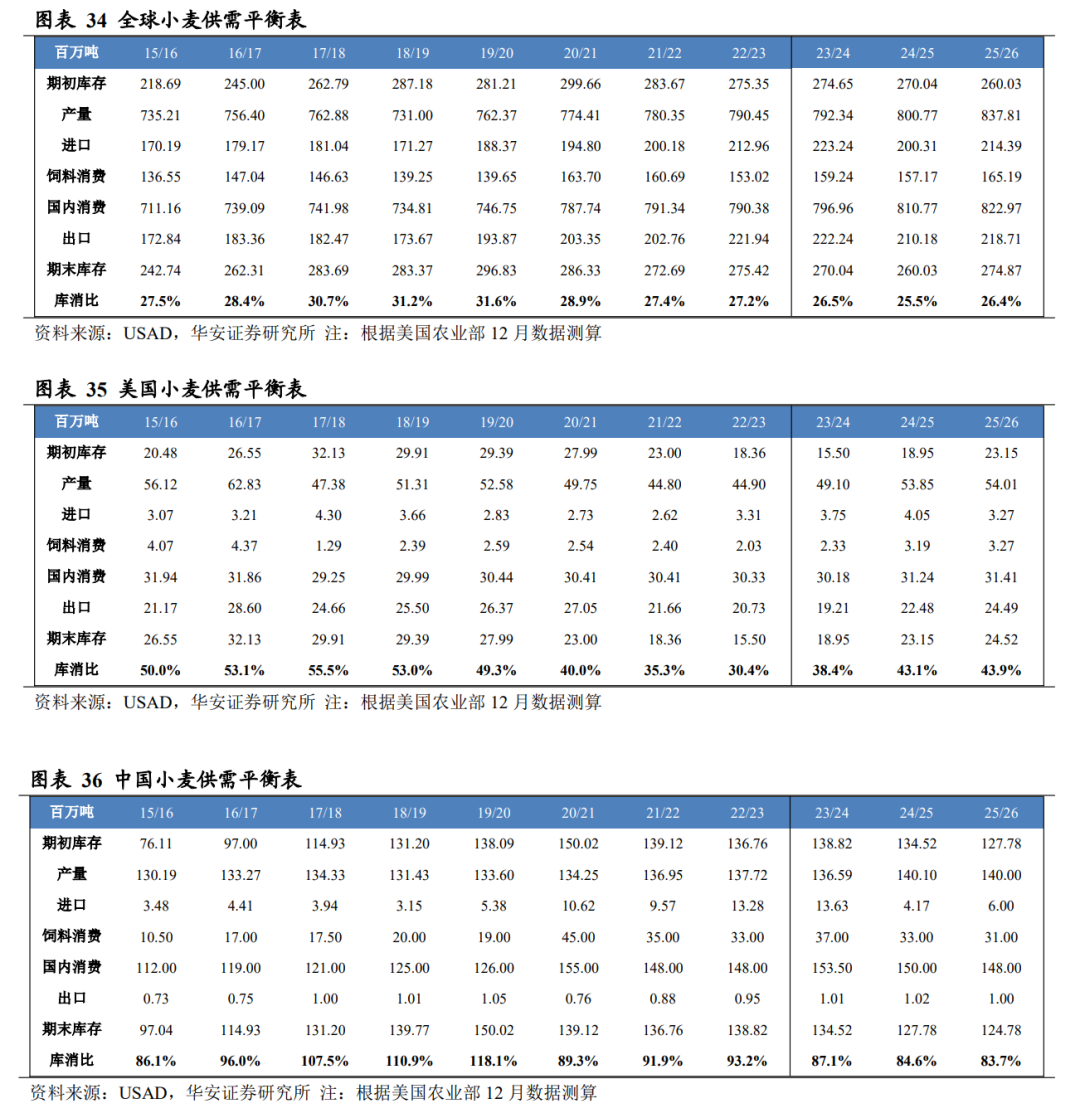 美国农业部 2025 年 12 月供需报告预测,2025/26 年度全球小麦产量 8.38 亿吨,国内消费量 8.23 亿吨,期末库存 2.75 亿吨,库消比 26.4%,较 24/25 年度上升 0.92个百分点