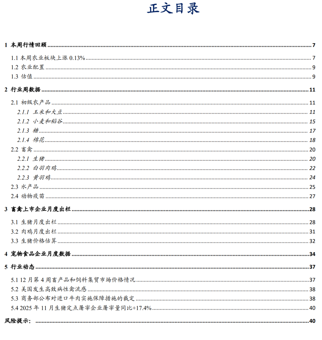 ①生猪价格反弹至 12.46 元/公斤。本周日,全国生猪价格 12.46 元/公斤,周环比+2.5%。涌益咨询(2025.12.26-2026.1.1):全国 90 公斤内生猪出栏占比 5.44%,周环比-0.07pct;50 公斤二元母猪价格 1553元/头,周环比+0.4%,同比-4.7%;规模场 15 公斤仔猪出栏价 319元/头,周环比+3.9%,同比-35%;②生猪出栏均重降至 128.66 公斤,大体重猪出栏占比降至 6.76%。涌益咨询(2025.12.26-2026.1.1):全国出栏生猪均重 128.66 公斤,周环比-1.04 公斤,较 2024 年、2025年同期分别+4.36 公斤、+4.56 公斤;150kg 以上生猪出栏占比 6.76%,周环比-0.25pct,较 2024 年、2025 年同期-1.13pct、+0.38pct;175kg、200kg 与标猪价差分别为 0.54 元/斤、0.68 元/斤;③生猪养殖行业全面持续亏损。生猪养殖行业持续亏损:i)自繁自养已连续 15 周亏损;ii)仔猪销售继续亏损;iii)外购仔猪育肥已连续亏损逾 5 个月,本周五外购仔猪育肥头均亏损 160.8 元。10 月末全国能繁母猪存栏量降至 3990 万头,月环比-1.1%,产能去化提速,我们判断,随着生猪养殖业全面亏损叠加调控政策持续落实,生猪行业有望持续去产能;④估值处历史低位,继续推荐生猪养殖板块。据 2025 年生猪预测出栏量,牧原股份头均市值 3,070 元、温氏股份 2,351 元、新希望 2,515 元、德康农牧 2,250 元、天康生物 2,886 元、立华股份 1,200元、天邦 859 元、正邦 4,286 元、巨星 2,200 元、神农 4,597 元、京基 3,100 元、东瑞 2,533 元,猪企估值多处于历史低位,我们继续推荐生猪养殖板块,重点推荐牧原股份、天康生物、温氏股份、立华股份。
