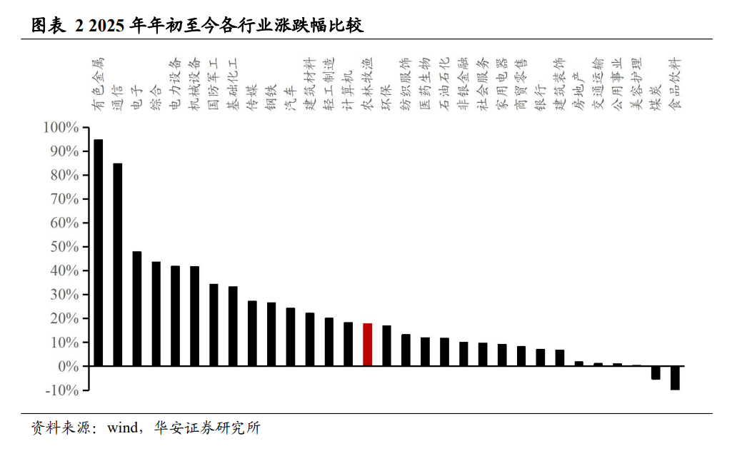 2025 年初至今,农林牧渔在申万 31 个子行业中排名第 15 位,农林牧渔(申万)指数上涨 17.79%,沪深 300 指数上涨 17.66%,中小板综指数上涨 31.61%。