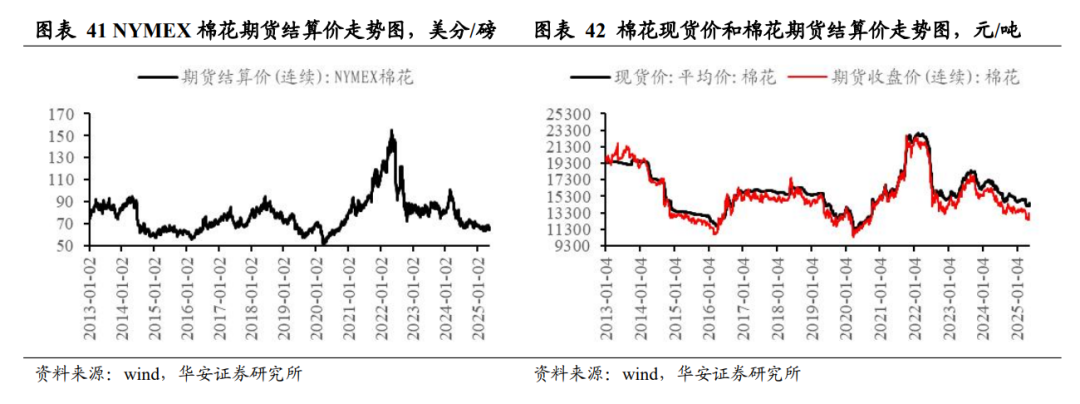 分国别看,2025/26 年度美国棉花产量 311 万吨,国内消费量 35 万吨,期末库存 98 万吨,库消比 32.6%,较 24/25 年度上升 3.20 个百分点;2025/26 年度中国棉花产量 730 万吨,国内消费量 839 万吨,期末库存 766 万吨,库消比 91.1%,较 24/25年度上升 1.94 个百分点。