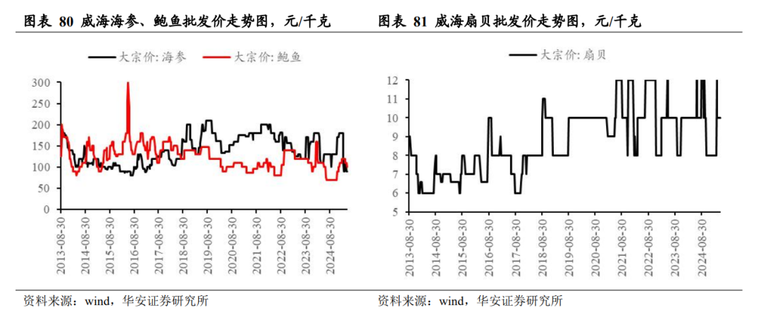 2025 年 12 月 26 日,威海海参批发价 90 元/千克,周环比持平,同比跌 47.06%;威海鲍鱼批发价 100 元/千克,周环比持平,同比涨 11.11%;威海扇贝批发价 10 元/千克,周环比持平,同比涨 25.0%。