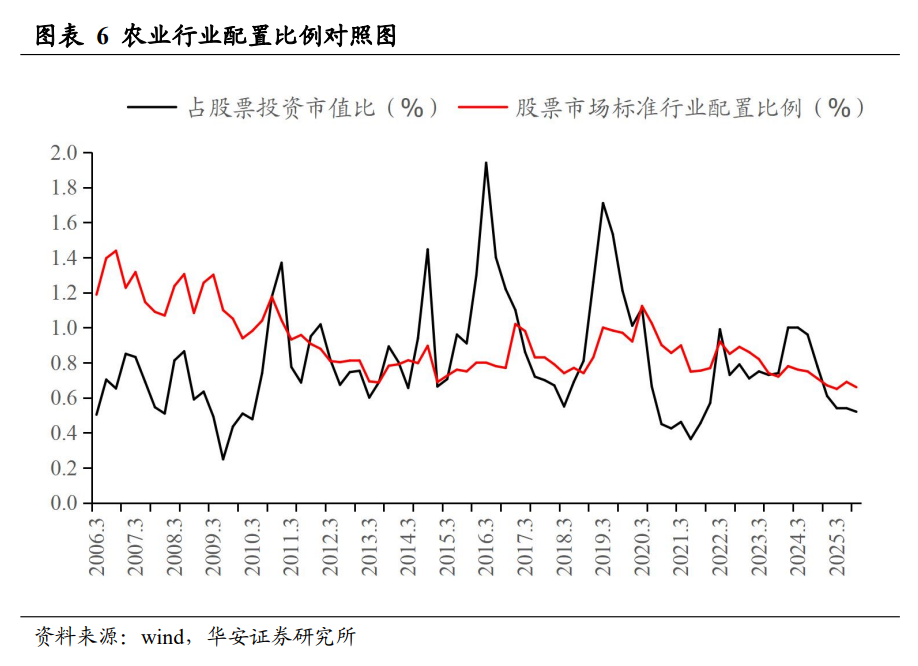 2025 年三季度末,农业行业占股票投资市值比重为 0.52%,环比下降 0.02 个百分点,同比下降 0.26 个百分点,低于标准配置 0.14 个百分点,低于历史平均水平。