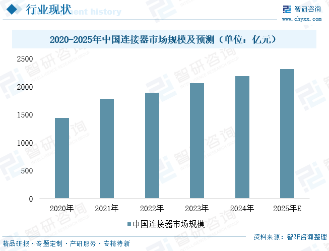 连接器作为实现电子设备电能与信号传输交换的核心基础元件,其市场需求与宏观经济发展及下游产业景气度紧密关联。近年来,在中国经济持续增长的背景下,国内通信、消费电子、汽车电子、工业控制与安防等连接器主要下游领域迅猛发展,共同推动中国连接器市场规模持续扩大,并保持稳健增长态势,使其成为全球连接器市场增长的重要引擎。2024年,中国连接器市场规模已达2058亿元,同比增长5.98%。随着连接器技术不断向新能源汽车、储能系统、低空经济等新兴领域渗透与融合,预计到2025年,行业市场规模将有望攀升至2312亿元。