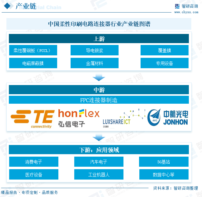中国柔性印刷电路连接器行业产业链各环节衔接紧密,上游以原材料供应为核心,涵盖柔性覆铜板(FCCL)、导电银浆、覆盖膜、电磁屏蔽膜及金属材料(如铜箔)等,其中FCCL占FPC成本的40%-50%,国内企业已突破高端基材部分技术瓶颈,但高频高速材料仍依赖进口;中游是核心制造环节,立讯精密、鹏鼎控股等头部企业主导,承担电路蚀刻、精密组装等工序,正朝着0.2mm以下小间距、多层互连等方向技术突破,行业集中度持续提高且头部企业开始布局海外产能;下游以消费电子为核心需求来源,同时新能源汽车带动的汽车电子成为高增长引擎,医疗设备、工业机器人等新兴领域也在不断拓展应用,各类终端产品对高频高速、高可靠性的需求持续推动产业链上下游协同升级。