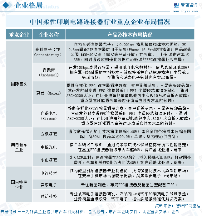 中国柔性印刷电路(FPC)连接器行业呈现清晰的梯队化竞争格局:第一梯队由泰科电子、安费诺、广濑电机等国际巨头主导,凭借深厚技术积累和高端产品矩阵,长期垄断汽车电子、航空航天与高端消费电子等核心市场,例如泰科在汽车连接器领域全球市占率超30%,广濑电机则以超薄间距连接器适配高端智能手机摄像头模组;第二梯队以立讯精密、中航光电等本土龙头为代表,依托全产业链整合能力与成本优势,深度绑定苹果、华为、比亚迪等国内外头部客户,不仅在消费电子领域占据重要份额,还通过“军转民”等技术迁移策略逐步切入车载高压与高速通信等高端应用,部分产品性能已接近国际水平;第三梯队则包括钜硕电子、中京电子等新兴企业,聚焦刚柔结合板、小批量定制等细分领域,以灵活服务和差异化产品适配医疗设备、工业机器人等利基市场,进一步丰富了产业生态并推动行业向多元化、专业化方向发展。