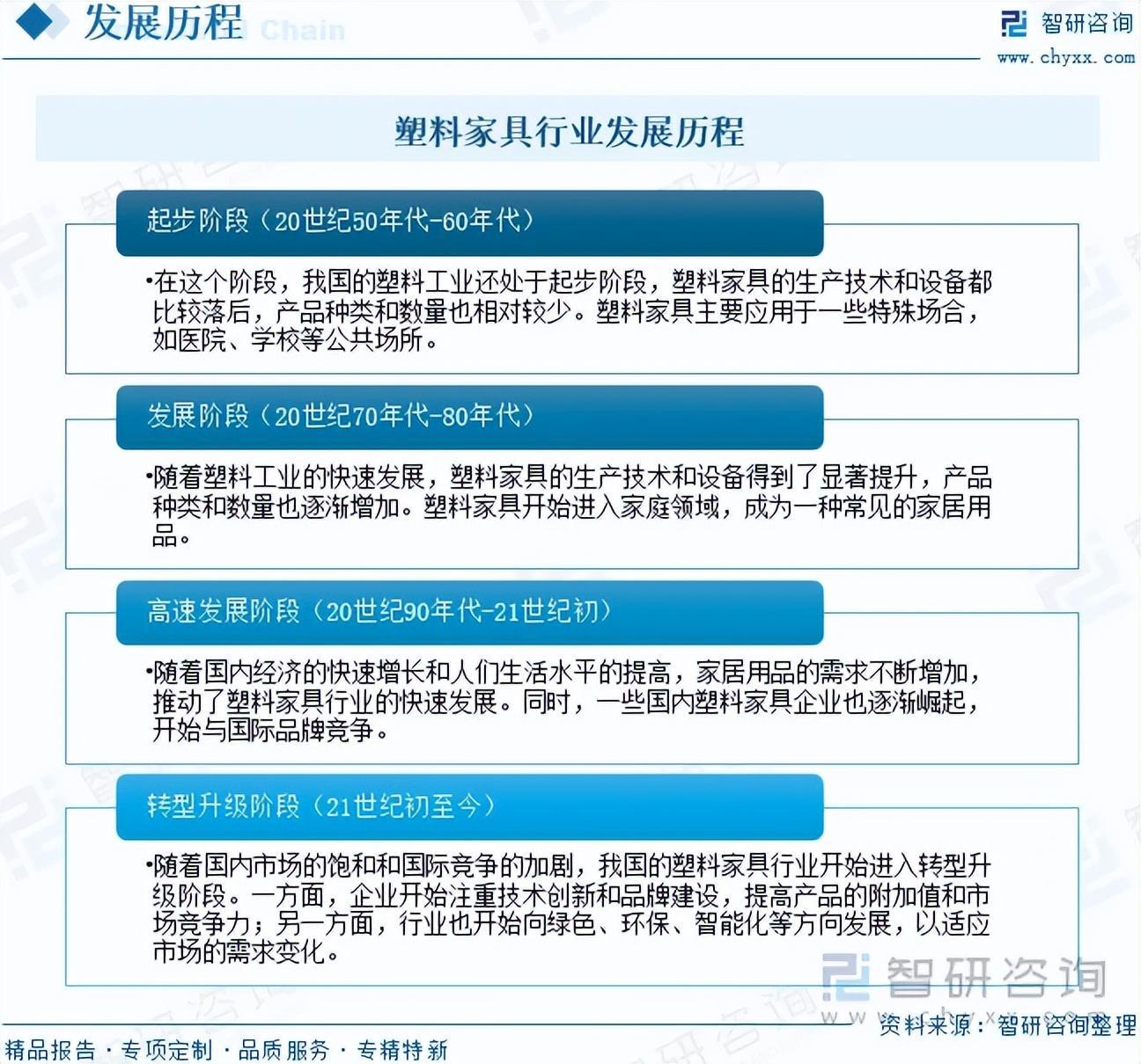 注:本文节选出自智研咨询发布的《研判2025!中国塑料家具行业发展历程、市场规模、进出口情况、竞争格局及未来展望:塑料家具出口持续增长,行业呈现良好发展态势[图]》行业分析文章,如需获取行业文章全部内容,可进入智研咨询搜索查看。