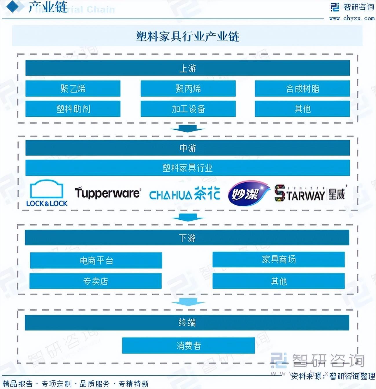 塑料家具产业链上游为原材料和设备,包括聚乙烯、聚丙烯、合成树脂、塑料助剂、加工设备等。产业链中游为塑料家具的生产制造。产业链下游为销售渠道,包括电商平台、家居商场、专卖店等,终端为消费者。