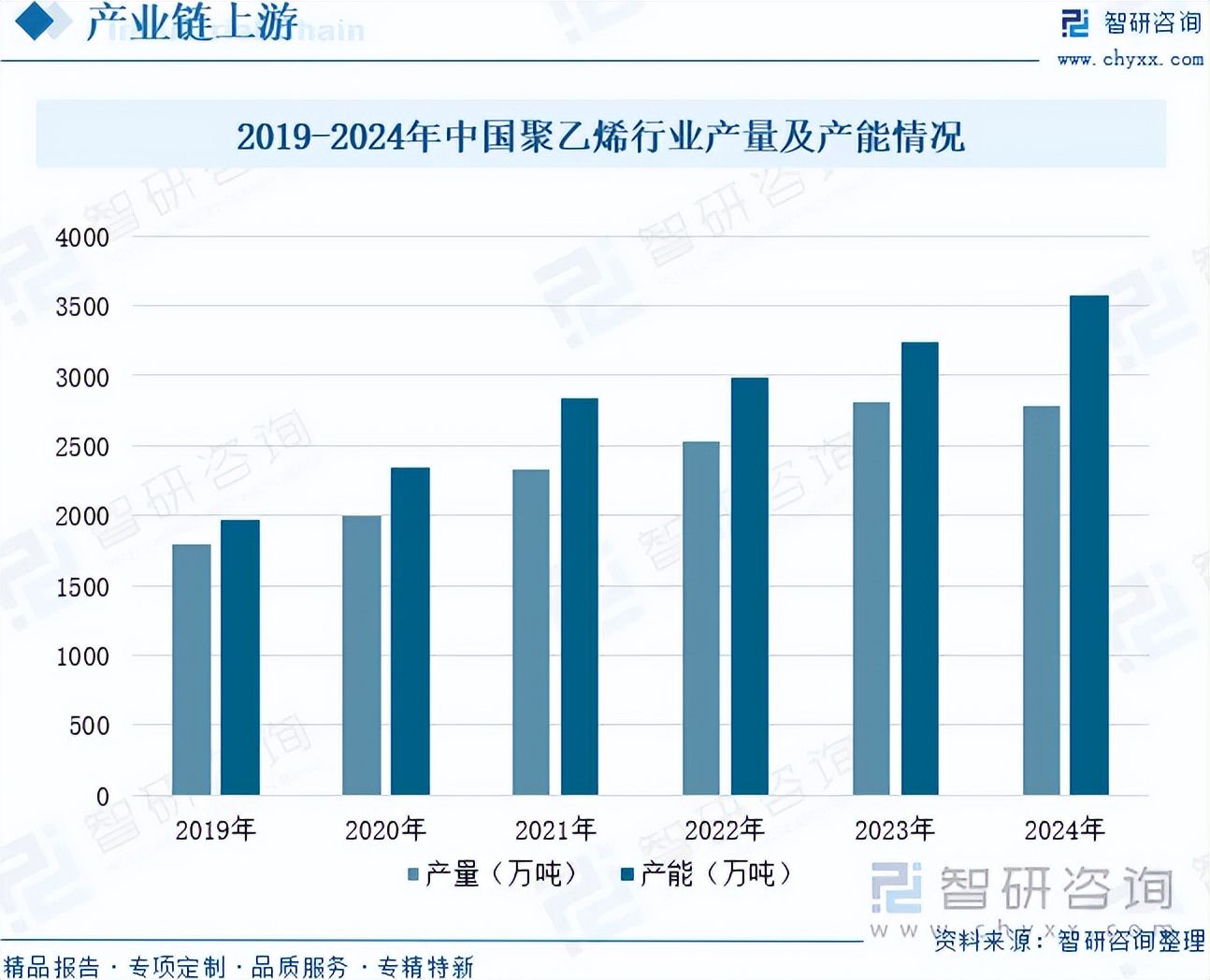 聚乙烯属于高分子乙烯聚合物,常温下为稳定的固态物质,是制作塑料的重要原材料。近年来随着我国经济的发展,聚乙烯市场需求增长迅速,中国聚乙烯产量及产能保持增长趋势。数据显示,中国聚乙烯产量从2019年的1793.61万吨增长至2024年的2791.41万吨,年复合增长率为9.25%;产能从2019年的1966万吨增长至2024年的3571万吨,年复合增长率为12.68%。未来,聚乙烯行业的稳步扩张,将从原料供给、材料创新和成本优化等多个维度,为中国塑料家具行业的持续发展提供有力支撑,推动其在产品性能、设计创新及绿色转型等方面实现进一步突破。