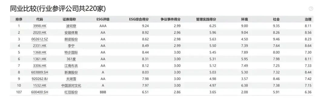 在ESG方面,红豆股份的表现并不突出。根据评分,红豆股份评级为BBB,位于行业中游水平。