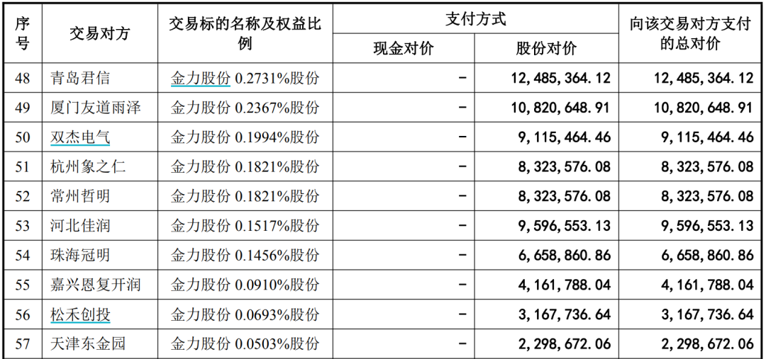 本次并购交易对手方高达102名!这意味着要同时与102个股东谈交易,时间短任务重,挑战极大。并购最终实现了将全部股东持有的金力新能源股权,全部“归集”置换为上市公司股票,也解决了标的公司股权分散的问题,为未来的稳定发展奠定了基础。