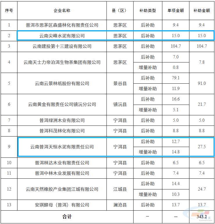 其中,中国建材集团旗下新天山水泥(天山材料)云南天山水泥成员企业——云南普洱天恒水泥有限责任公司,获12.7万元后补助及14.8万元增量补助,合计27.5万元;尖峰集团控股子公司云南尖峰水泥有限公司,获后补助 15万元,2家水泥企业拟获补助总额为42.5万元。