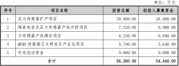 募集资金扣除相关发行费用后,将全部投入五大项目:压力传感器扩产项目拟投入26,860万元,项目建成后将新增2,800万只压力传感器产能,涵盖陶瓷电容式、MEMS、玻璃微熔等多种类型,应用于汽车、商用空调、储能产品等领域;陶瓷电容式压力传感器产线升级项目拟投入6,900万元,通过技术改造提升产线自动化水平与产品工艺精度;力传感器产线建设项目拟投入6,040万元,新增年产50万只力传感器产能,产品包括拉压力传感器、力矩传感器、六维力传感器等;MEMS传感器芯片研发及产业化项目拟投入5,640万元,开展多款芯片技术研发并实现产业化,满足公司自产需求;另有9,000万元用于补充流动资金,缓解业务扩张带来的运营资金压力。