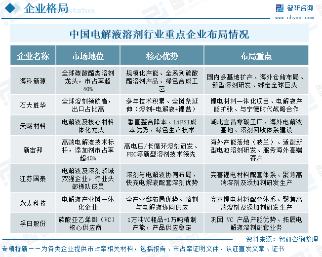 中国电解液溶剂行业企业布局情况