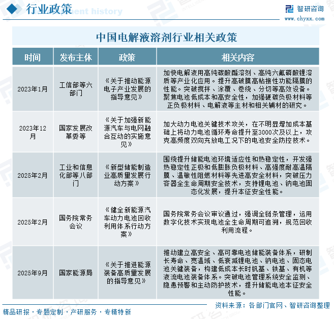 电解液溶剂是新能源电池产业链的关键材料,直接决定电池的能量密度、循环次数和安全水平。近年来,我国新能源汽车、储能等终端产业爆发式增长,带动电解液溶剂需求持续攀升,行业规模快速扩张,同时出台了《关于推动能源电子产业发展的指导意见》《关于加强新能源汽车与电网融合互动的实施意见》《新型储能制造业高质量发展行动方案》《健全新能源汽车动力电池回收利用体系行动方案》《关于推进能源装备高质量发展的指导意见》等多项政策,从产业发展引导、技术创新支持、环保标准规范、回收体系建设、装备升级保障等多个维度,为电解液溶剂行业划定明确发展方向,既推动企业加大高纯度、绿色化、新型溶剂的研发投入,又通过完善产业链配套、降低政策合规风险,助力行业实现规模化、高质量发展,同时应对国际市场碳足迹追溯等合规要求。