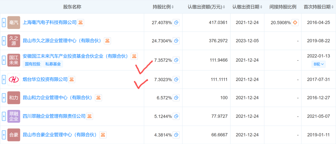 这里头,烟台华立投资、昆山禾诚的实控人均为个人,安徽国江未来基金实控人为江淮汽车(600418.SH),中山西湾的控股股东为中山市产业投资母基金(有限合伙)、中山西湾投资控股发展有限公司,石河子明照(部分退出)的实控人为三一集团,中鼎股份(000887.SZ)的大股东为中鼎集团。