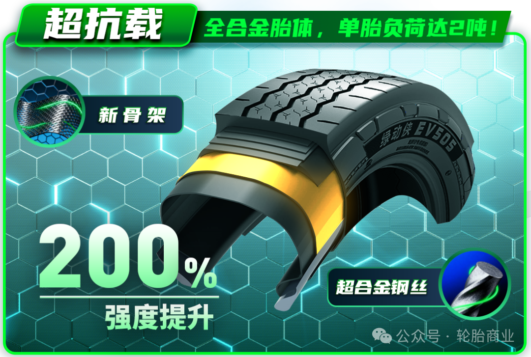 EV505胎体采用与贝卡尔特联合研发的超强超韧全合金钢丝,其强度较普通钢丝高40%,较半钢胎聚酯帘线更是提升200%。配合冠部"2层钢丝带束层+1层尼龙冠带"的多层保护结构,通过行业首创成型工艺,打造全球首创全体合金胎体。单胎载荷可达2吨,超出该规格国标70%,为重载运输提供坚实支撑。