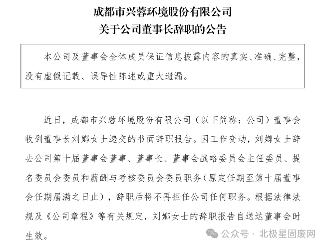 #北极星固废网 获悉,2026年1月7日,兴蓉环境发布公告,公司董事会收到董事长刘嫏的书面辞职报告。