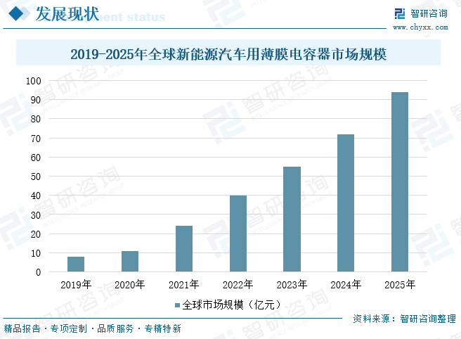 伴随着新能源汽车产销规模不断扩大,新能源汽车用薄膜电容器产业也呈现蓬勃发展态势,行业规模持续增长。数据显示,2019-2025年期间,全球新能源汽车用薄膜电容器市场规模由8亿元增长至94亿元,实现年复合增长率50.8%。
