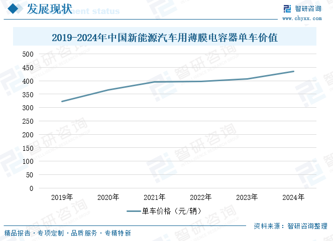 随着新能源汽车多电机配置应用越来越多,带动薄膜电容单车用量的提升。同时,新能源汽车高压平台技术升级,也提升了更高性能薄膜电容用量。在此背景下,中国新能源汽车用薄膜电容器单车价值由2019年的322.1元/辆提升至2024年的434.5元/辆。