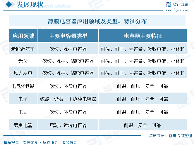 薄膜电容器被誉为电子电路中的“基石”,其应用十分广泛,涵盖新能源汽车、新能源发电、工业设备及家用电器等领域。在新能源汽车领域,主要电容器类型为滤波、脉冲电容器,对其核心要求为耐温、耐压、大容量、吸收电流、小体积等。