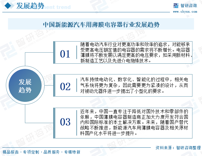 未来,随着电动汽车行业对更高功率和效率的追求,对能够承受更高电压额定值的电容器的需求将不断增长。电容器薄膜将不断发展以满足更高的电压要求,如采用新材料、新制造工艺以及先进介电绝缘技术。同时,汽车持续电动化、数字化、智能化的过程中,相关电气系统将更为复杂,因此需要更为紧凑的设计,从而对被动元器件进一步提出了小型化的要求。此外,近年来,中国一直专注于降低对国外技术和零部件的依赖,中国薄膜电容器制造商正加大力度开发符合国内和国际标准的本土解决方案。未来,随着国产替代战略不断推进,新能源汽车用薄膜电容器及相关原材料国产化水平将进一步提升。