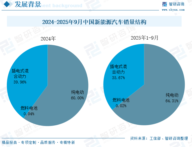 新能源汽车销售市场中,纯电动汽车占据主导地位,2024年销量占比为60%,2025年1-9月占比提升至64.31%;主要原因为行业企业加大投入攻克技术难题,显著提升了汽车产品的质量性能,纯电动乘用车平均续驶里程已接近500公里,充电速率提升3倍多,消费者对于续驶里程的焦虑已经明显减弱。2024年插电式混动汽车销量占比39.96%,2025年1-9月占比为35.67%。