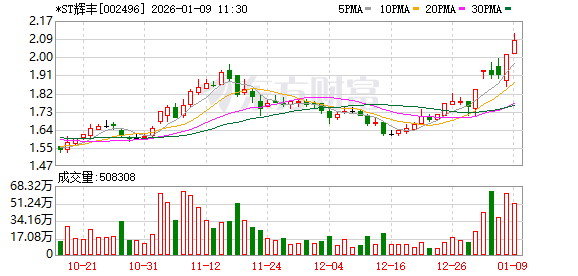 *ST辉丰再度涨停,6个交易日内录得4个涨停,累计涨幅为20.57%,累计换手率为23.55%。截至10:09,该股今日成交量3325.83万股,成交金额6853.31万元,换手率2.99%。最新A股总市值达31.81亿元,A股流通市值23.47亿元。(数据宝)