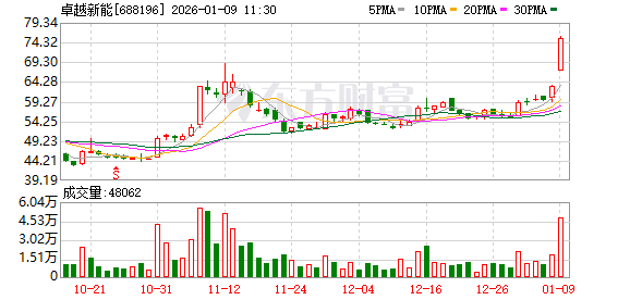 1月9日盘中科创板股卓越新能涨停,截至10:36,股价报75.74元,成交2.30亿元,换手率2.65%,振幅13.88%。