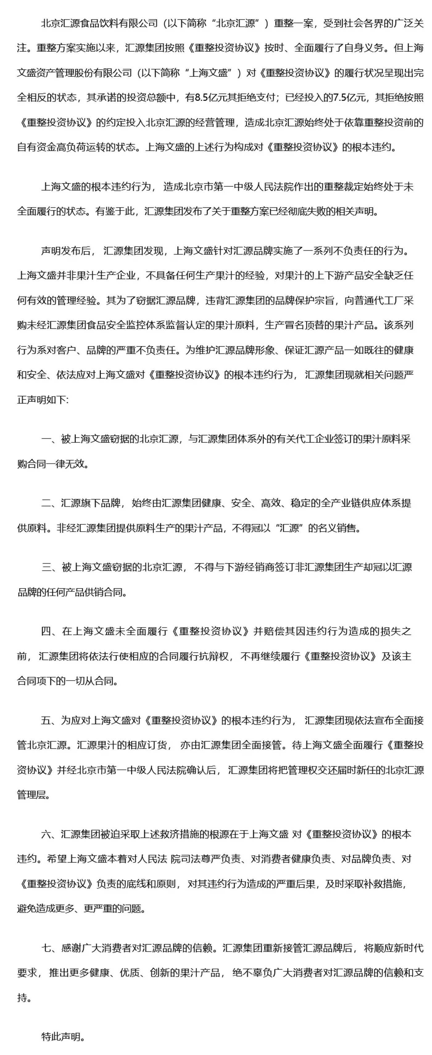 在声明中,汇源集团不仅痛陈上海文盛违背商业诚信,更明确提出了三项核心诉求与制裁措施,正式宣告收回控制权。