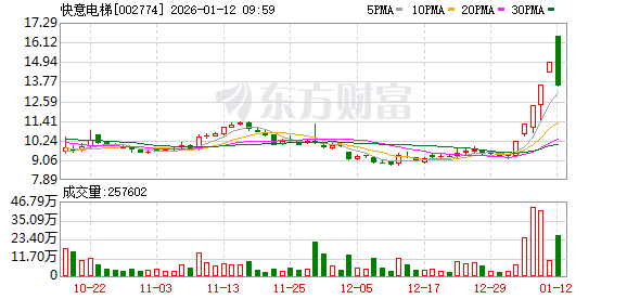 快意电梯盘中涨停,已连收6个涨停板,截至9:25,该股报16.45元,换手率0.21%,成交量60.38万股,成交金额993.25万元,涨停板封单金额为5.31亿元。连续涨停期间,该股累计上涨77.26%,累计换手率为45.33%。最新A股总市值达55.39亿元,A股流通市值46.35亿元。