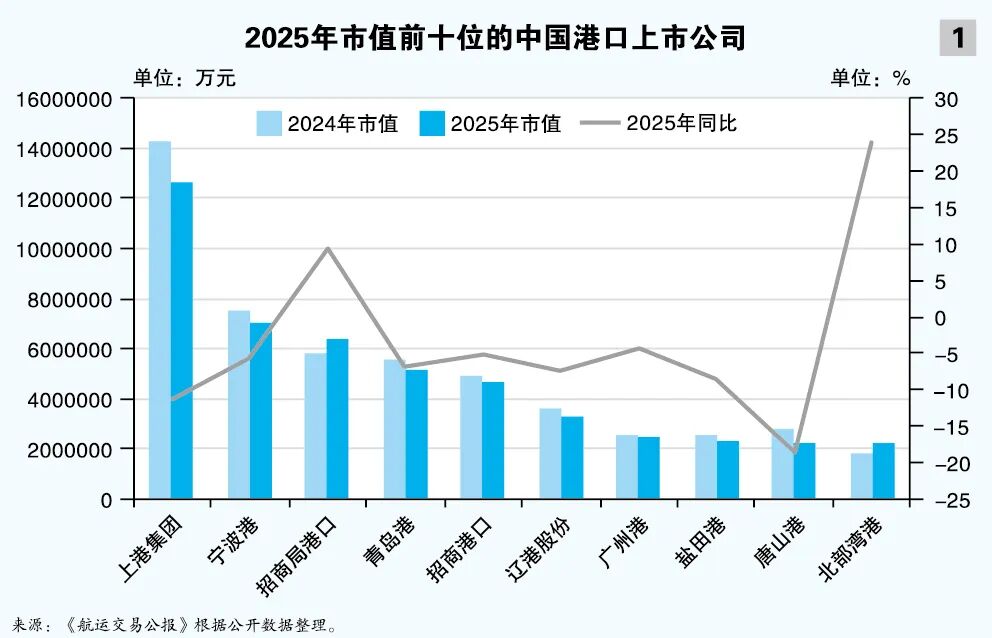 2025年,上港集团以1261.78亿元市值名列《2025年中国港航船企市值排行榜》(《市值榜》)第3位,排名不变,同比下降 11.44%。2025年前三季度,上港集团实现主营收入299.49亿元,同比增长3.18%;实现净利润112.73亿元,同比下降4.56%。前11个月,上海港集装箱吞吐量超5050万TEU,其中洋山港各码头完成集装箱吞吐量2625万TEU。