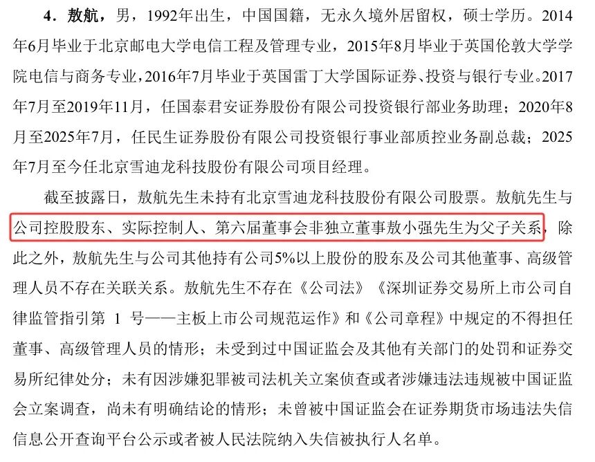 值得注意的是,敖航和雪迪龙实控人敖小强先生为父子关系。