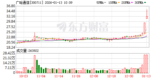 广哈通信股价创出历史新高,截至9:35,该股上涨8.16%,股价报31.68元,成交量1288.68万股,成交金额4.19亿元,换手率5.19%,该股最新A股总市值达78.94亿元,该股A股流通市值78.70亿元。