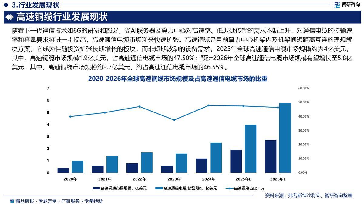 为探究高速铜缆行业变化趋势(怎么变)、用户需求(要什么)、投放选择(投向哪)、运营方法(如何投)及实践案例(看一看),智研咨询发布了《2026-2032年中国高速铜缆行业市场发展规模及未来前景研判报告》。