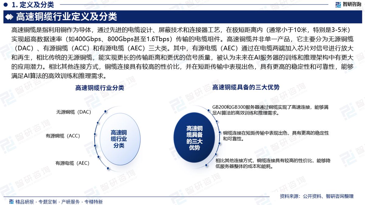 行业定义及分类:高速铜缆是指利用铜作为导体,通过先进的电缆设计、屏蔽技术和连接器工艺,在极短距离内(通常小于10米,特别是3-5米)实现超高数据速率(如400Gbps、800Gbps甚至1.6Tbps)传输的电缆组件。高速铜缆并非单一产品,它主要分为无源铜缆(DAC)、有源铜缆(ACC)和有源电缆(AEC)三大类。
