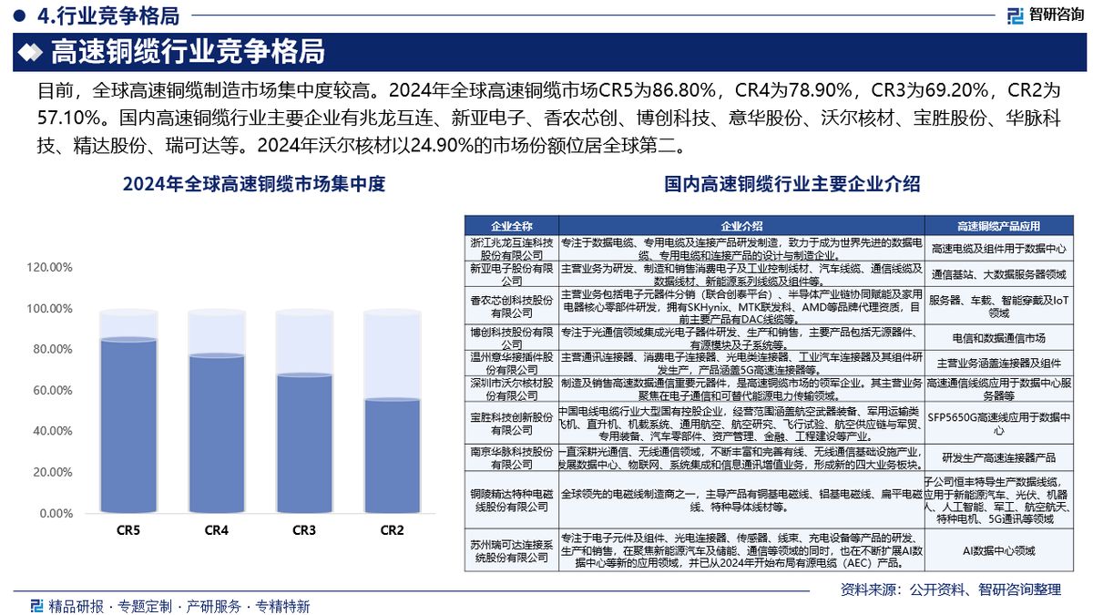 竞争情况:目前,全球高速铜缆制造市场集中度较高。2024年全球高速铜缆市场CR5为86.80%,CR4为78.90%,CR3为69.20%,CR2为57.10%。国内高速铜缆行业主要企业有兆龙互连、新亚电子、香农芯创、博创科技、意华股份、沃尔核材、宝胜股份、华脉科技、精达股份、瑞可达等。2024年沃尔核材以24.90%的市场份额位居全球第二。