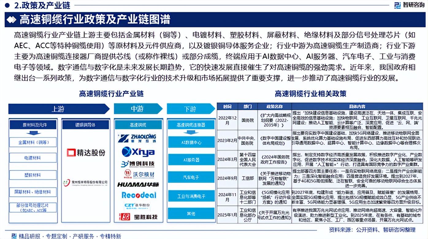 行业政策:数字通信与数字化是未来发展长期趋势,它的快速发展直接催生了对高速铜缆的强劲需求。近年来,我国政府相继出台一系列政策,为数字通信与数字化行业的技术升级和市场拓展提供了重要支撑,进一步推动了高速铜缆行业的发展。如《数字中国建设整体布局规划》《5G规模化应用“扬帆”行动升级方案》《关于开展万兆光网试点工作的通知》等。